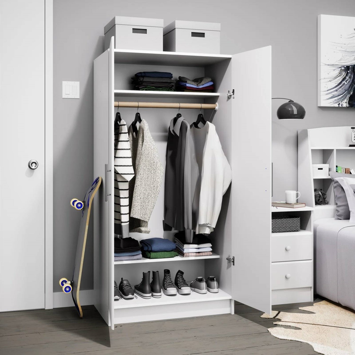 • Ample Storage Space: Description The Wardrobe Closet offers you a wall cabinet and clothes organizer all in one. Designed as a free-standing pantry, this white closet offers a significant internal storage capacity of 18.75" D x 30.25" W x 59" H.