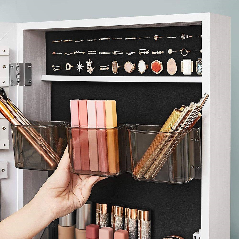 Full length mirror? Right in front of you. Storage space? With 92 earring places, 36 rings slots, 1 bracelet rod, and 32 necklace hooks, this Modern Black Metal White Wood Jewelry Armoire Cabinet Organizer Mirror on Wheels holds your ever-growing jewel collection, zealously. Yes! 2 facial mask bags, a 3-slot brush tray, a 10-slot lipstick tray, and 4 shelves inside the cabinet corral all your beauty secrets. Look! A shelf and a drawer below hold bags or books; as for greenery, decorations? Why not? Since your jewelry reflect your taste, keep them in style in this eye-pleasing jewelry organizer—with a cabinet in a rustic brown finish and rich wood texture, it oozes a chic and classy appeal. Fill it, move it, lock it in place, check out your outfit with the large, full-length mirror. You can easily glide this jewelry cabinet with 4 wheels from one room to another and lock it in place as you get ready for a night out. With a pre-assembled cabinet, simply attach the frame and the bottom shelf by following the illustrated instructions, then insert the fabric drawer, and that’s it—now it’s your time to make yourself look stunning. Say Goodbye to Chaos and Embrace Shipshape. This integrated jewelry cabinet is what you need for better organization. Featuring a spacious jewelry cabinet, a full-length mirror, an open shelf, and a drawer, it corrals all the out-the-door necessities in one place, maximizing space and saving time.