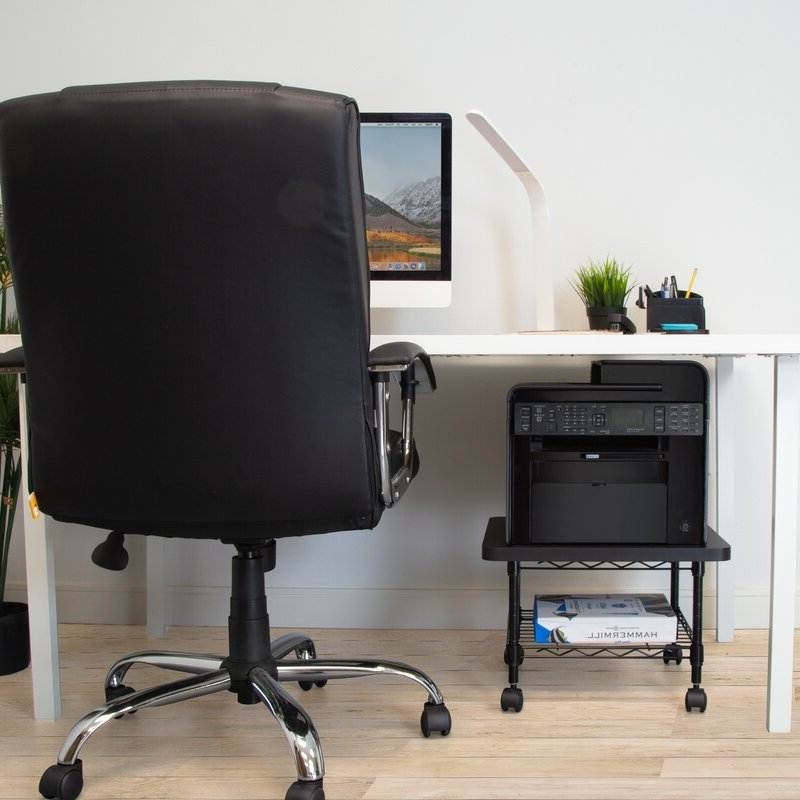 This under desk black printer cart with wheels holds printers, scanners, and fax machines off your desk. Clear out your desktop space for a more ergonomic, organized, and focused desk setup. This versatile and multi-functional cart is designed for use in offices, educational environments, mailrooms, cubicles, classrooms, dorm rooms, and libraries. Sturdy construction, simple assembly, storage shelves, and a wheeled base make it an ideal choice for a variety of home, office, and educational environments. The printer stand's steel frame and durable laminate top offer stability and durability. Heavy-duty design can hold up to 100 pounds of equipment and supplies - 50 pounds on each shelf.